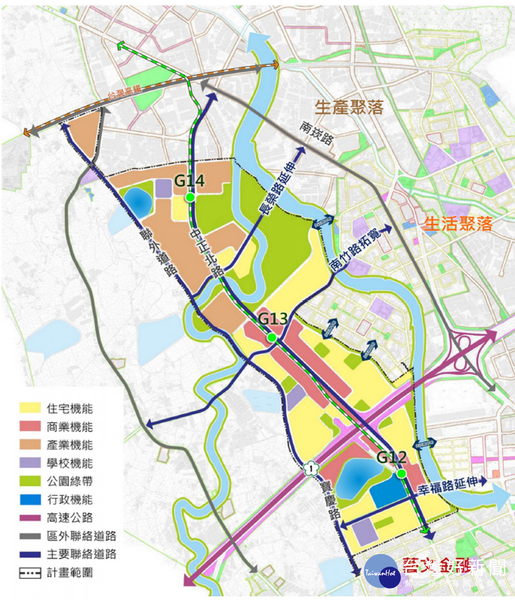 市府都發局長江南志表示,G12、G13及G14整體開發計畫備受各方關注,彙整109、113年公展後民眾的意見,重新調整定位,以打造全桃園第一處以水岸環境而生的都會生活圈為目標。依循地景風貌,在G13和G14站間的南崁溪、茄苳溪交會處劃設41.5公頃的公園綠地,未來可作為都會河濱公園, 公園周邊則劃設產業專用區,可讓休閒遊憩產業進駐,預見以後民眾透過捷運,可輕鬆抵達享受河濱特色的綠地公園。